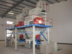 该机性能稳定,设计合理。水泥、添加剂先由提升机提至预混机进行混合,砂子等大骨料直接提入主机同已混合好的水泥添加剂进行二次混合,混合好的成品落入储料仓等待包装。本机为双轴无重力混合机,性能优良,易操作、效益高,4人操作即可,每次可上料搅拌1吨(按骨料不同略有差别)。混合时间1-3分钟,每小时可生产6吨左右。