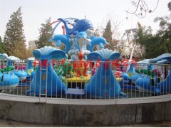 激战鲨鱼岛游乐设备是一款一旋转为主,在设备旋转的同时游客可以拿起座舱上的水枪进行设计,进而达到互动级趣味性的增强。激战鲨鱼岛这套设备共有12个座舱,可以乘坐24人,设备包括主题景观,座舱和大臂,主题景观突破传统单调的黑色主题,变成成了独特的蓝色和五颜六色的海洋生物造型,这样增加了设备的趣味性和吸引力,当鲨鱼岛运转的时候,游客可以一边随着座舱围绕主题旋转一边拿起手中的水枪向中间主题进行攻击,当击中目标后,中间的动物造型及会做出喷水、举手等各种动作,姿态可爱,趣味性强,而位于正中的鲨鱼先生,鲨鱼先生会喷出水柱向游客攻击,这样增加了设备的趣味性和互动性。