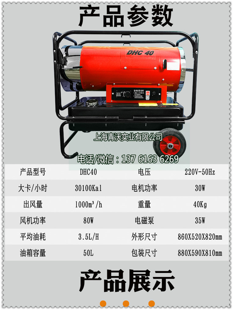 性能出色:20-80KW的热量输出,300℃以上的出风温度,仅需220V电源,大尺寸轮毂,大容量油箱,全自动运转,移动性强,这是一款值得我们骄傲的燃油工业热风机产品,它可以满足你的任何需求。