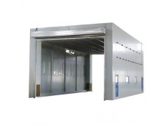 整体移动式喷漆间的设计目的,是为了满足较大型工件 打磨或喷漆的需要。一般情况下每套房体对应2~3个排风净化工位,哪个工位上的工件需要喷漆时,房体则行走移动到那个工位,其他工位可以继续打磨工作,待 房体内的工件喷漆完毕后,再控制移动房体行走到打磨完毕后的工件工位,如此设计可以实现大型工件的不间断连续喷漆工作。房体为钢结构构造,房体立柱下面设置有两台电动驱动行走机构,行走机构沿地面轨道行走。移动房体两端设置有电动卷帘大门,房体行走时,大门升起,待到达位置时,大门降落关闭。大门与行走机构由电气控制部分连锁控制,大门完全升起后,房体才可移动行走。