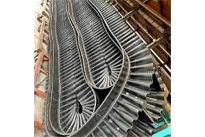 山东青岛上料机挡边输送带, 是由基带、挡边、横隔板3部分组成。挡边起防止物料测滑撒落的作用。为便于绕过滚筒,档边设计成波纹状;横隔板的作用是承托物料,为了实现大倾角输送,采用T型TC型。档边和横隔板是用二次硫化的方法与基带连接的,具有很高的连接强度。