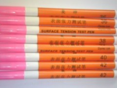 表面张力测试笔,又名达因笔、电晕笔、电晕处理笔、及塑料薄膜表面张力检测笔。表面张力测试笔是薄膜表面电晕度(达因)的测试工具,专门用于测定薄膜受电晕处理后的效果。表面张力测试笔有32、34、36、38、40、42、44、46、48、50、52、54、56、58、60或以上十多种不同张力的试笔,能准确地测试出塑料薄膜表面张力是否达到试笔的数值。令使用者清楚了解此薄膜是否适合于印刷、复合或真空镀铝等等,从而有效地控制质量,减少因材质不合格所造成的损失。