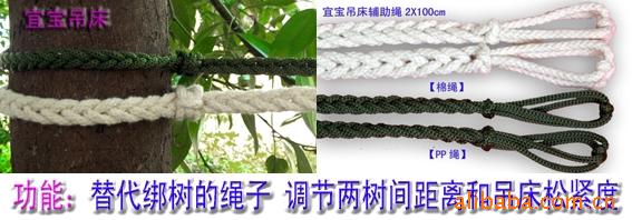 ★辅助绳★:2X100cm人性化设计(非常实用 解决了亲们不会编结绑吊床和两棵树距离太远而吊床不够长的问题 切记哟!挂床不要太高1米为适 长时间睡在上面记得把吊床拉紧哟!!)