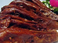 鸭脖子,又名酱鸭脖或酱鸭脖子,属于酱汁类食品(主要是酱板鸭,包括酱鸭翅、酱鸭脖、酱鸭拐、酱鸭掌、酱鸭舌、酱牛肉、酱板鱼、酱板干子、酱板藕等),最早起源流传于清朝洞庭湖区的常德,经湖南流传至四川和湖北,近年来风靡全国。酱汁类食品通过多种香料浸泡,然后经过风干、烤制等工序精致而成,成品色泽深红,具有香、辣、甘、麻、咸、 酥、绵等特点,是一道佐酒佳肴。